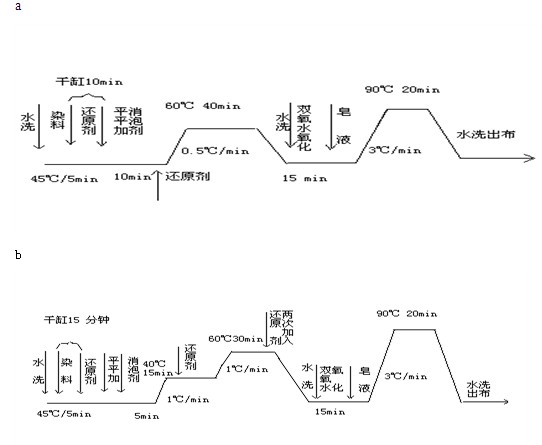 a 、織物進(jìn)缸熱水洗5分鐘,加入緩染劑,同時還原染料用酒精在化料槽內(nèi)打漿溶解。加入燒堿、保險粉干缸還原10分鐘,缸內(nèi)待室溫時,將還原染料以溢流方式加進(jìn)染缸循環(huán)。加入消泡劑、平平加,及剩余燒堿、保險粉循環(huán)10分鐘,以0.5℃/分鐘升溫60℃循環(huán)40分鐘,降溫溢流水洗,加雙氧水進(jìn)行氧化處理15分鐘,水洗加皂液以3℃/分鐘升溫90℃循環(huán)20分鐘,降溫沖洗出布。